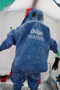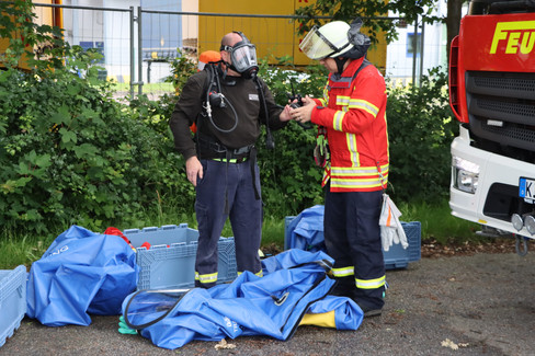 Danach rüsteten sich die Einsatzkräfte mit ihrer Schutzausrüstung aus. Hierzu gehören neben dem Atemschutzgerät ein Chemikalienschutzanzug (CSA)