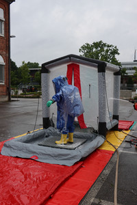 Los ging es mit der Einrichtung eines Dekontaminationsplatzes. Dazu wurde ein kleines aufblasbares Zelt mit integrierter Dusche auf einer farbigen Plane aufgestellt und ausreichend Waschmittel zur Verfügung gestellt.